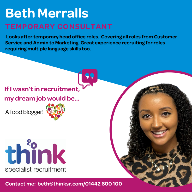 Beth joined the business as a Resourcer at the end of 2019 and was promoted to a Consultant role in the Summer of 2020 where she began looking after a couple of key accounts whilst also managing our temporary services across Watford, St Albans and the surrounding area.