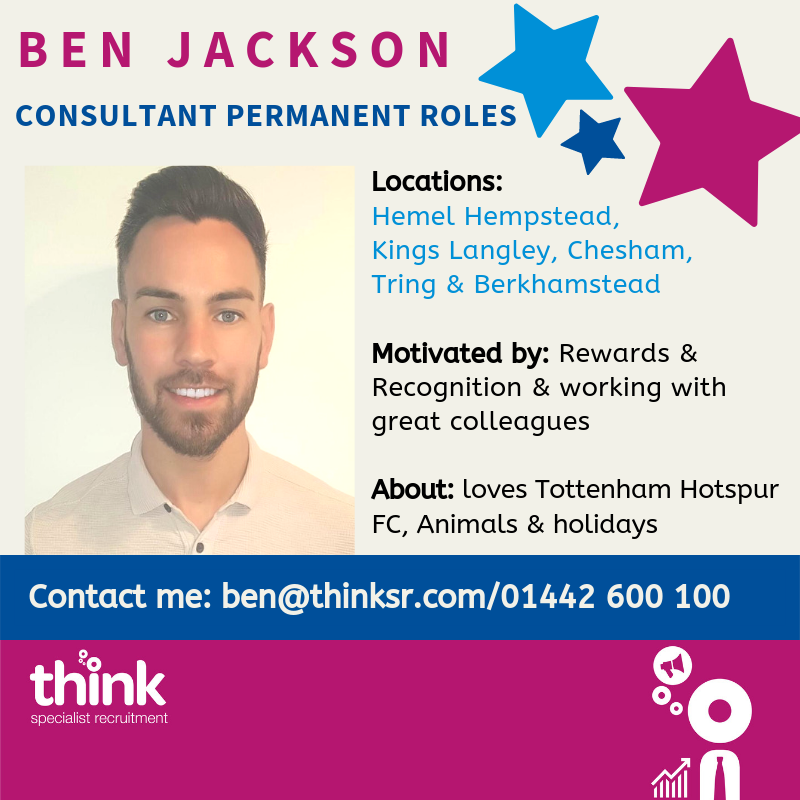 Ben is responsible for permanent recruitment in the Hemel Hempstead, Kings Langley, Tring, Chesham and Berkhamsted areas. If your business is based in this area and you would like to discuss your hiring requirements, Ben can be contacted on 01442 600100 or [email protected]
