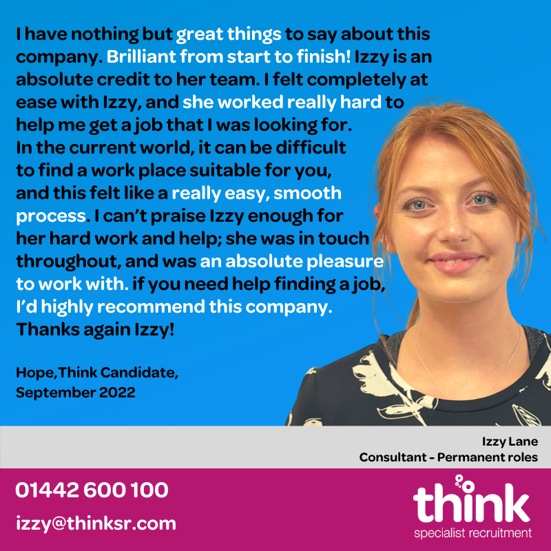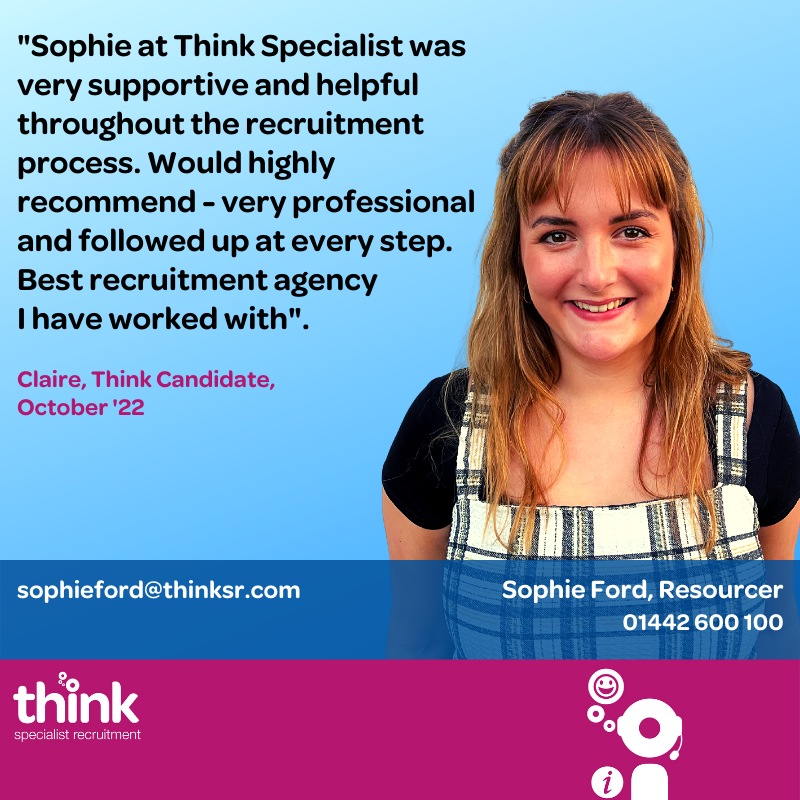 Just over a year later I am still here and have learnt so much! From starting completely new to the recruitment world I received an unbelievable amount of support and training. Everyone has been so great and the opportunities have been endless. From joining straight away I felt the environment was fantastic and it didn’t take me long to settle in at all. Everyone made me feel so comfortable and the support I received has been amazing. Once I had settled as a Resourcer I was then given a number of options of which path I could take next. From this I was given the fantastic opportunity to take on the Hemel desk as a permanent consultant and have loved it so far! It has been a rollercoaster of a year but I can honestly say I couldn’t have done it without the support or guidance from my team. Bobby and Chris have both been amazing and so encouraging throughout the journey. They have helped me through all the ups and downs. I am still learning everyday but can’t believe how much has changed since I first started! If like me you are unsure of where to go next then I would highly recommend the recruitment world – especially here at Think!