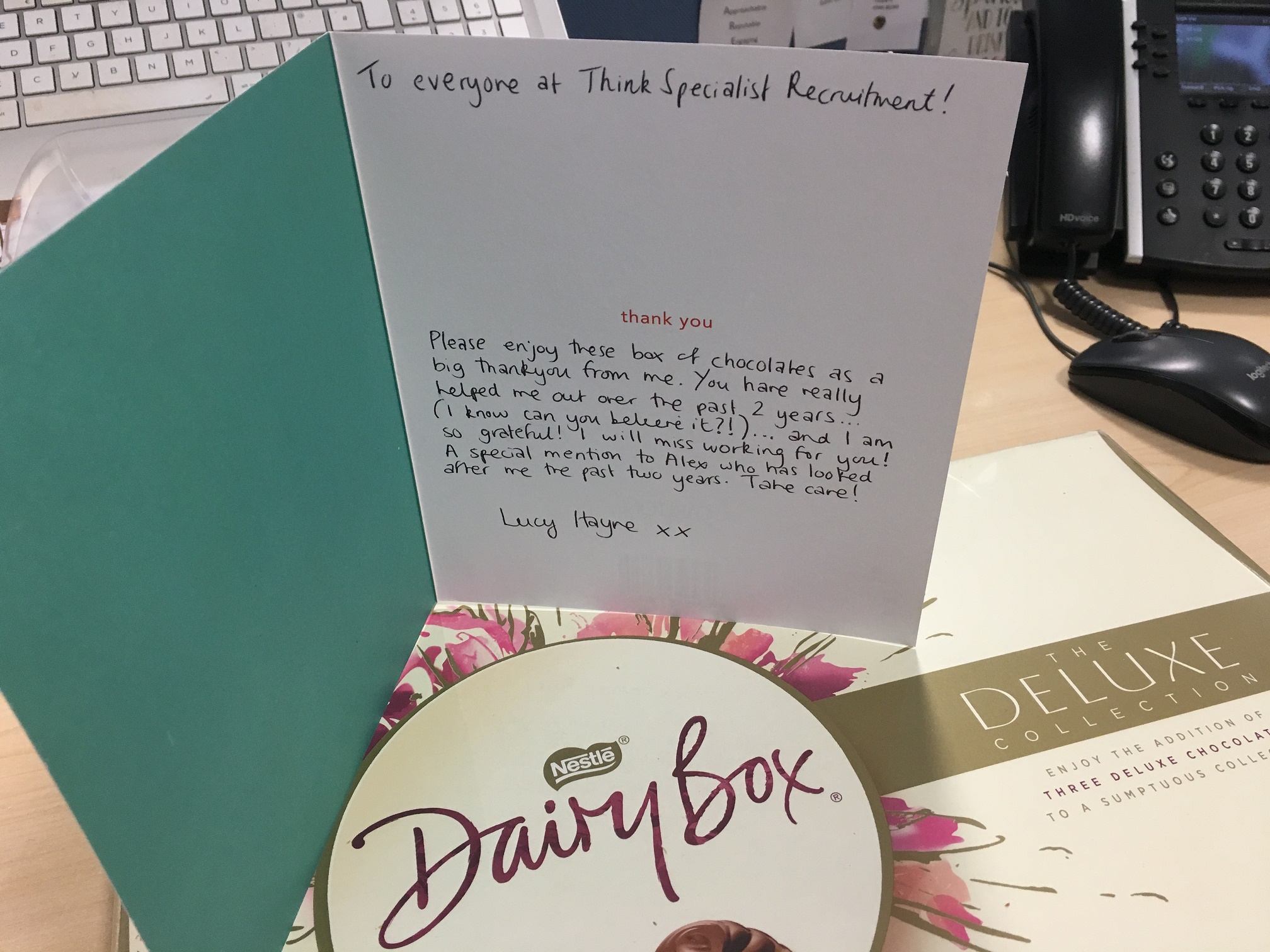 Lucy said: "To everyone at Think Specialist Recruitment, please enjoy this box of chocolates as a big thank you from me. You have really helped me out over the past 2 years and I am so grateful! I will miss working for you! A special mention to Alex who has looked after me for the past two years. Take care!"