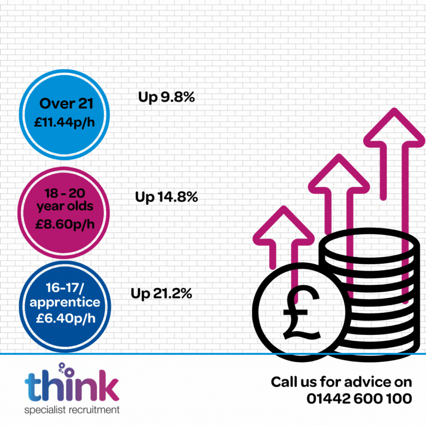 The minimum wage is currently set at £10.42 per hour for workers over 23, and to £10.18 per hour for workers aged 21-22. When the new rate takes place in April, this will represent an increase of 9.8% for over 23s, and of 12.4% for over 21s.