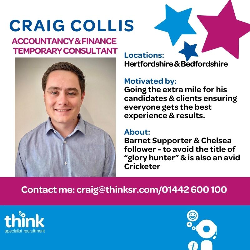 We're looking forward to Craig growing the Think Accountancy & Finance division alongside of Clare who has made fantastic progress since she joined the business in February this year. Despite the impacts of Covid-19, Clare has made permanent placements across the Herts, Beds and Bucks area and is currently recruiting for several roles.